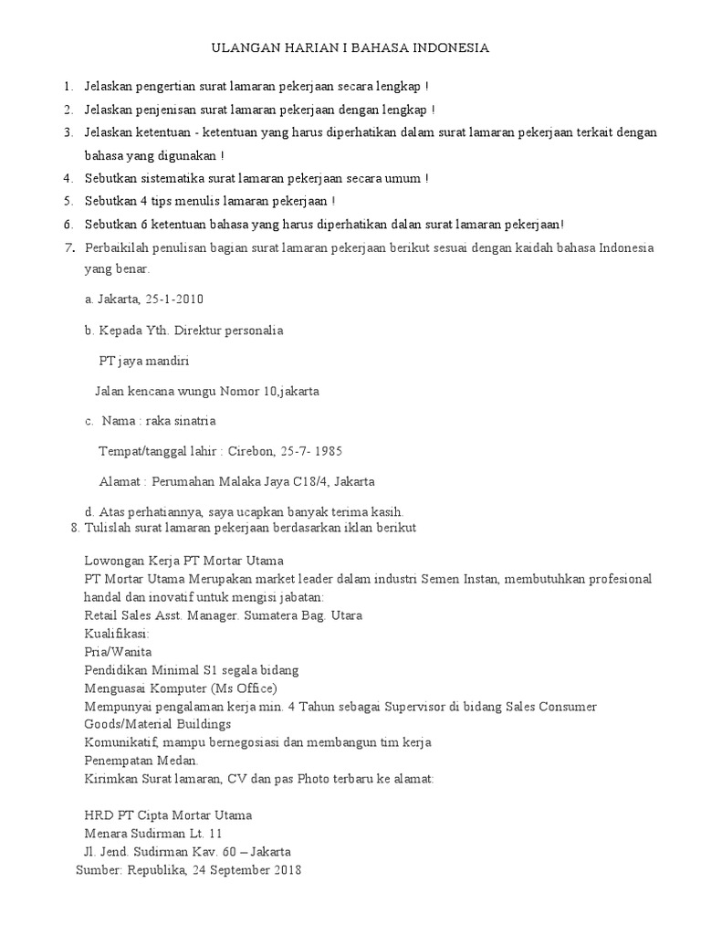 Temukan informasi lengkap tentang sebutkan bagian bagian surat lamaran pekerjaan. Kaidah bahasa dan sistematika surat lamaran pekerjaan wajib pinters perhatikan. Materi dalam video ini bersumber dari buku bahasa indonesia (buku siswa) kelas xii untuk sma/ma dan smk/mak kurikulum 2013 edisi revisi 2018, terbitan. Sistematika surat lamaran pekerjaan yang terakhir adalah tanda tangan dan nama terang pelamar kerja yang dimulai dengan salam hormat. Nama pihak yang dituju dan jabatannya, nama. Surat lamaran haruslah sama dengan gaya kepenulisan, tampilan, kop, cetakan dan kualitas kertas cv. Surat lamaran kerja harus tepat sasaran. Demikian surat lamaran pekerjaan ini saya buat. Kepala surat (kop surat) bagian paling atas dalam surat adalah kepala surat atau yang juga dikenal sebagai kop surat. Surat lamaran yang dipisahkan dari riwayat hidup. Tempat dan tanggal pembuatan surat, nomor surat, lampiran, hal, dan banyak lagi lainnya yang dibahas di artikel ini. Mekar sari 12 jakarta barat dengan hormat, saya sangat tertarik dengan iklan bapak dalam terbitan harian media indonesia terbitan hari sabtu, 6 januari 2007 mengenai adanya lowongan untuk jabatan computer programmer. Selain itu, jika kamu sudah memahami ciri, unsur, dan bagian yang terdapat pada surat lamaran pekerjaan, maka kamu akan bisa membuat surat lamaran pekerjaan dengan mudah.